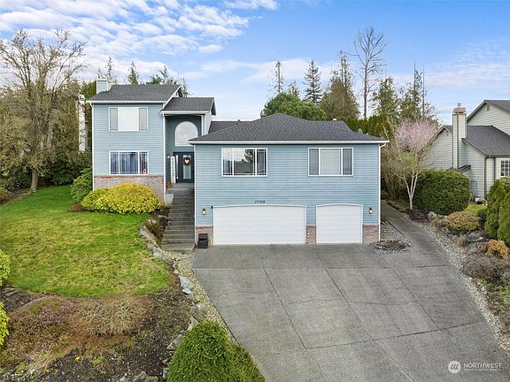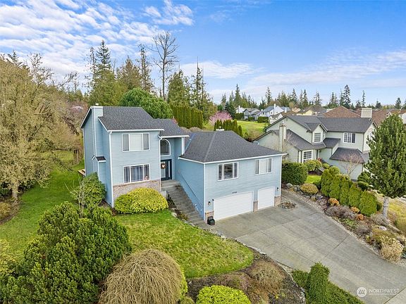 Desirable GLENEAGLE location backing to the 2nd hole of the golf course with gorgeous sunset and Olympic views! This 4-bedroom, 2.5-bath offers a rare main floor primary suite featuring a completely RENOVATED 5-piece bath, walk-in closet and Westerly views! The spacious, UPDATED kitchen features granite countertops, tile backsplash, stainless appliances, pantry and views of the course! The main floor also includes a guest bedroom, utility room with storage, a living room and family room, each with fireplaces, formal dining room with barn doors and a guest bathroom. Two additional guest bedrooms and full bathroom round out the upstairs. Large deck perfect for entertaining, mature landscaping, newer 50-year roof, AC and a 3-car garage!