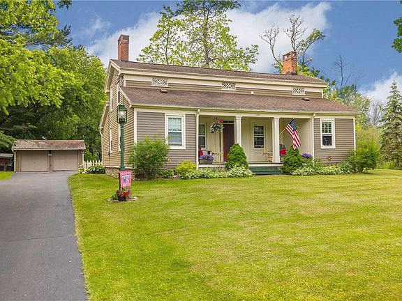 This historic home on beautiful Lake Road in Webster is filled with charm and updated modern amenities. Set on nearly 8 acres of a serene wooded landscape, this truly unique property includes an impressive yard, 2 out barns, detached 2 car garage on a private, park-like setting. The rear outdoor entertaining space provides a natural gorgeous surrounding with a woodburning firepit, table locations for outdoor eating and a beautiful pergola. This historic home, originally built in 1840, retains much of its stunning woodwork, refinished hardwood floors, and charming built-ins. With a total 4 bedrooms including a master on the first floor, 2 full baths, a cozy family room with fireplace, an enclosed back porch and more, there’s a lot to love about this rare find! All of this within 30 minutes of downtown Rochester. Delayed Negotiations: No showing until 6/8/23 at 9am; no Negotiations until 6/12/23 at Noon.
