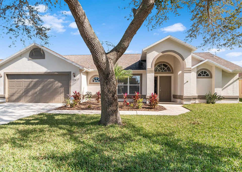 You will be calling this Viera 3 bedroom, 2 bathroom pool house Home Sweet Home. This home features laminate flooring throughout and kitchen has plenty of cabinets and counter space. Kitchen overlooks family room which makes it ideal for entertaining. There is an additional office or den and a formal dining room. Spacious Master bedroom has a walk in closet and bathroom that includes double sinks, garden tub and walk in shower. The 2 guest bedrooms have large walk in closets and share bathroom leading out to the pool. Screened in Lanai has natural gas hookup ready for your BBQ's and a fun swimming pool. Backyard is fenced in and includes shed to store your lawn mower and other items . NEW AC unit. Convienently located near I95, Avenues Viera, and just quick drive to the beach.