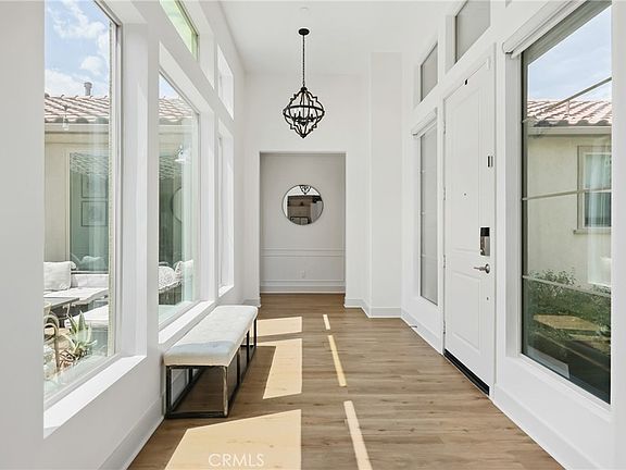 The backyard is an entertainer's dream with a covered patio, built-in lighting, artificial turf, lush plants, trees, cement areas, a gas-powered fireplace, retaining wall, and a covered barbecue and bar. Enjoy gorgeous sunset views from this beautifully landscaped yard. The atrium is adorned with a decorative water feature and blooming flowers. Additional upgrades include a tankless water heater, an extra-large laundry room, and abundant storage.