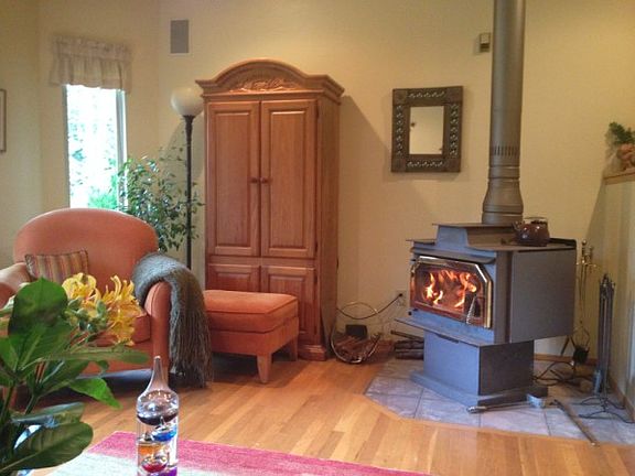 Magical scenic setting celebrates nature! Charming, owner built 1 1/2 story home w/cedar siding. Floor plan has easy flow w/vaulted ceiling, hardwood floors, built-in library unit, dining rm and home office. Wood stove & alternative energy. Bright, luminous, freshly painted. Country at its finest. Garden and chicken coop, Outbuildings. E-SE-SW exposure. Completely fenced property. Nice variety of trees. Location idea for short commute. Peaceful & Private!