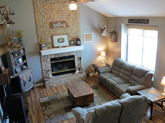 Located on blacktop in Kearney School District and close to Jesse James Farm. Home is very well maintained and smoke free. Sits on approximately 2.5 acres in a very quiet area with great neighbors. It has an attached 2 car garage, 3 bedrooms, 2.5 bathrooms, steel siding, walk in closets with built in shelving, wood burning fireplace in the living room, pantry in kitchen, finished basement as a possible 4th bedroom with a closet and half bathroom. 16x20 storage shed with brand new siding. Large fire pit area, fenced in back yard and a 12x30 metal sided shop with a concrete floor. Willing to negotiate leaving the couch and love seat in the living room along with living room tables and/or dining room table with benches.