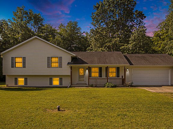 Beautiful 17 acres plus a great family home! Located just minutes north of town with easy access to US 131. Quality built home offers 2300 sqft of living space & features 5 spacious bedrooms, 3 full baths and even a convenient laundry room The family room has daylight windows & even a hobby room on the lower level. A nice kitchen w/ new appliances offers a dining area w/ sliding doors to a patio. Newer furnace & central air. There is a peacefulness from the surrounding trees. Make the acreage your playground with nature hikes & even build a treehouse.