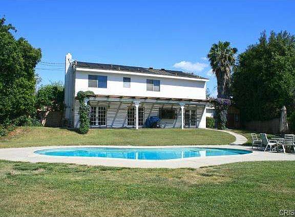 Grand Two Story Colonial Pool Home Located in the Heart of Northridge Situated at end of a Desirable Cul-De-Sac Street on a Deep 12,100+ Sq. Ft. Lot. Offering 5 Bedrooms, 2.5 Baths, Over 2300 Sq. Ft. of Living Space with Beautiful Entry Door with Window Accents, Formal Living Room with New Wood Laminate Flooring, Marble Fireplace with Custom Mantle, French Doors, and a Formal Dining Room leading to a Bright Kitchen with Tile Counters, Garden Window, Built-in Appliances and Convenient Breakfast Area. Downstairs Bedroom now used as Den with Custom Built-ins/Media Niche. Upstairs with 3 Secondary Bedrooms and Master Suite with His & Her Mirrored Closets and Private Bath with Dual Sinks and Dressing Area. Fabulous Entertainers Rear Yard with Solar Heated Pool, Expansive Lawn Area, Fruit Trees, Covered Patio, Side Yard and Storage Shed. Additional Amenities Include: Custom Crown Moldings, New AC and Copper Pipes, Fresh Paint Inside & Out, Newer Garage Door and Opener, and Conveniently Close to CSUN, Granada Hills Charter High School, Shopping and More! It's a Must See!