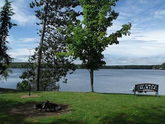 Perfectly positioned for expansive views of the lake and evening sunsets, with 137' of sandy frontage and gentle slopes-no stairs! Cute cottage is ready to enjoy, even on chilly days with a wood-burning fireplace and plenty of charm to warm your soul. Corner kitchen windows over the sink open to water views that make even cleaning up a pleasure. 2 garages for over 3 stalls of storage for the toys!