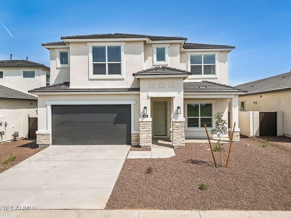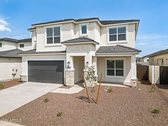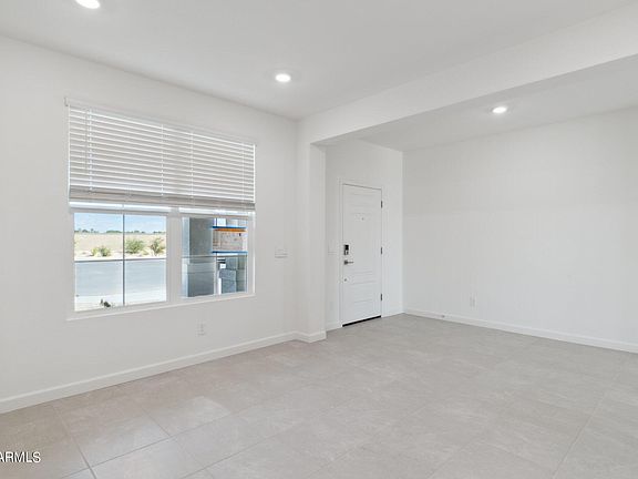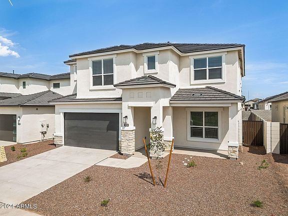 This home features 36'' white shaker cabinetry, 18x18 tile, a large kitchen island, quartz counter tops, and 9' ceilings throughout. It also includes a soft water loop, dual pane low-E windows, multi-zone thermostat, window coverings and a smart home system. The exterior features front desert landscaping, a covered patio and generous backyard. Conveniently located off the 303, this community is near Costco, Safeway, and shopping. **Finishes may vary from sample photos and virtual tour.