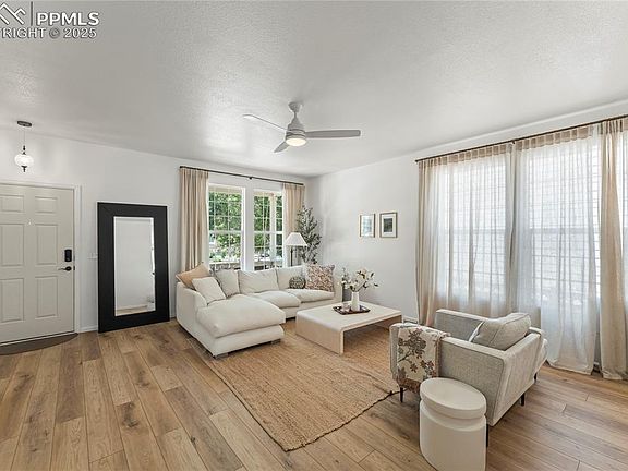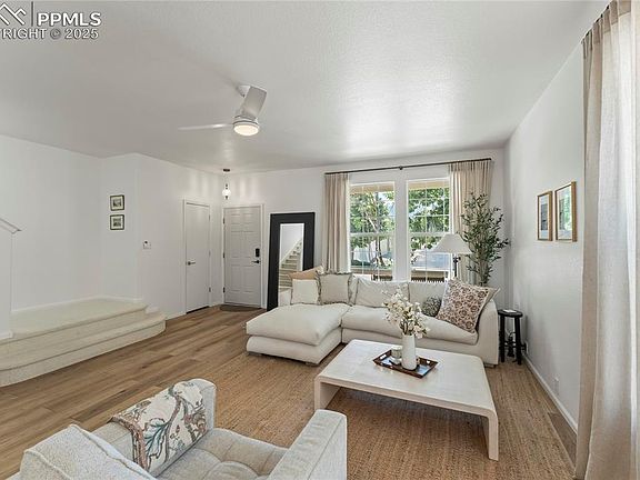 Welcome to a home that truly stands out in the heart of the South Colorado Springs area! Bursting with charm and thoughtful updates, this beautifully refreshed property features new flooring, fresh paint, stylish fixtures, and newer appliances—all with a designer’s touch. From the moment you walk in, the spacious living room invites you to relax and unwind, while the open-concept layout, soaring 9-foot ceilings, and seamless flow into the dining and kitchen areas make entertaining a breeze. Upstairs, you'll find a bright landing that leads to three generously sized bedrooms, including a cozy and inviting primary bedroom and bath. Beat the summer heat with the comfort of central A/C, and enjoy the outdoors in your fully fenced backyard with easy-care xeriscaping—perfect for hosting, pets, or simply soaking up the Colorado sunshine. To top it all off, a generously sized detached 2-car garage sits at the rear of the home, offering extra storage and convenience. This home is the total package—stylish, functional, and move-in ready!