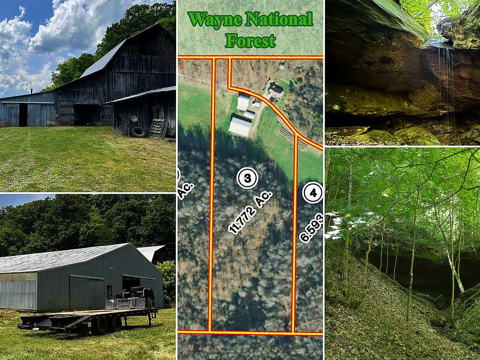 The Barns and Caves on Wayne National Forest 11.8 Acres with Large Barns, Tremendous Rock Features and Beautiful Creek Adjacent to Wayne National Forest