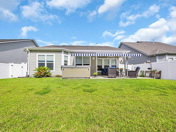 OPEN HOUSE, SATURDAY, October 4th from 11- 2 PM. Don't miss this stunning Hemingway model in Park Place at Market Common. Featuring 3 bedrooms, 2 baths, and an inviting open floor plan, designed for both comfort and style. OUTDOOR HOT TUB & Tons of upgrades! The spacious living area is enhanced by vaulted ceilings and bright oversized windows, creating a light-filled gathering space that flows seamlessly into the chef’s kitchen. Here you’ll find 42" white cabinetry, quartz countertops, stainless steel appliances, pendant lighting, and a designer tile backsplash. Mohawk RevWood flooring spans the main areas, with ceramic tile in wet zones and plush carpet in the guest bedrooms. The primary suite is a true retreat, complete with a zero-entry spa shower and dual vanities. Additional upgrades include a HALO whole-house water filtration system, garage screen door, in the guest bath is a walk-in bathtub with heated seat and self-cleaning functionality, wallpaper to accent some areas, custom window shades, and a convenient doggie door. Enjoy your very own hot tub, gas fireplace, ring cameras, motion lighting, wallpaper to accent some areas, custom window shades, a convenient doggie door and outdoor irrigation. Step out back to a private oasis with no home behind you—just trees, a beautiful view, and direct access to the bike trail. A 24’x11’ patio awning with an automatic wind detector provides the perfect spot to relax or entertain, surrounded by palm and sable trees and gorgeous landscaping. Epoxy garage & driveway and elegant paved walkway to front door. Located in the prestigious Market Common community, this home combines luxury, natural gas living, and walkable access around the lake, to the beaches, shopping, dining, HGTC and community entertainment. All measurements and square footage are approximate and not guaranteed. Buyers are responsible for verification of all information, including HOA info.