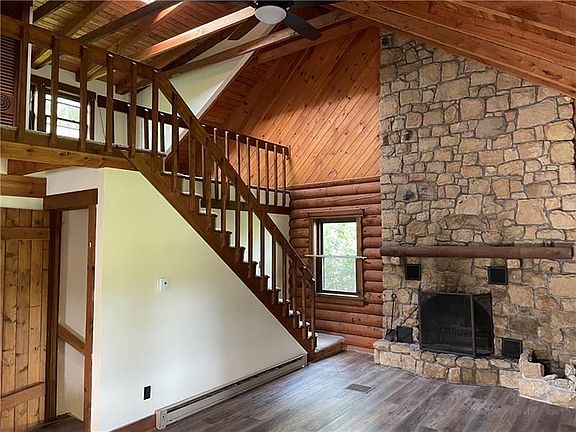 RESIDENTIAL OR COMMERCIAL CHARMING LOG HOME ON 3.73 ACRES SO CLOSE TO THE GROVE CITY EXIT OF I-79, NEW FLOORING, SOME LIGHTING, NEW WALKWAY, DETACHED TWO-CAR GARAGE INCLUDES A 2 ROOM OFFICE, 2 BEDROOMS, 2 FULL BATHS AND VERY USABLE 2ND FLOOR LOFT. GORGOEUS 2 STORY STONE LOG-BURNING FIREPLACE, LARGE DECK AND A BILCO-STYLE DOOR TO THE SPACIOUS BASEMENT. GREAT PLACE FOR A HOME BUISNESS WITH A 2 ROOM OFFICE OFF THE GARAGE.