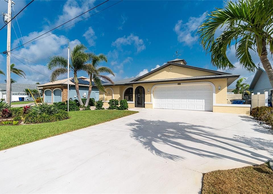 ENJOY AN ISLAND LIFESTYLE. MATLACHA ISLES RARELY AVAILABLE 3 bedroom, 2 bath, pool, 2 car garage and oversized driveway on an intersecting canal, minutes away from OPEN WATER/NO LOCKS!! In 2018 the boat dock was updated(approx. and has a fish cleaning station, water, and power. A BOAT LIFT was also added. Beautiful TIKI HUT/GAZEBO out by pool deck and dock for your enjoyment, watching sunsets or sunrises with friends and neighbors! Kitchen appliances were updated in last 4 years to WHIRLPOOL STAINLESS STEEL, FRENCH DOOR REFRIGERATOR, MICROWAVE, OVEN RANGE with GRANITE COUNTER TOPS AND A BREAKFAST BAR!! Split floor plan with large primary bedroom and walk in closet. New well pump for irrigation. A/C works great and has been serviced every 6 months with maintenance records available. ROOF is METAL and was done in 2001, and should last another 30 years. There was minimal damage from Hurricane Ian, with no flooding on this property. Water heater was replaced in 2023. Flooring is tile in the kitchen, carpet in the living area, bedrooms, dining and family rooms. Tile is also in the bathrooms and hallways. This property is close to Ft. Myers Beach where you can go by boat and dock for lunch, and listen to live entertainment at “BONITA BILL’S”, or go on to Sanibel/Captiva or Useppa Island. Blocks from grocery, drugstore, restaurants, shopping, the beach and medical offices and 23 miles to the hospital in Cape Coral. Approximately 28 miles to the international SW Regional Ft. Myers airport! Please view the beautiful pictures and schedule to see this fantastic property that won’t last long.