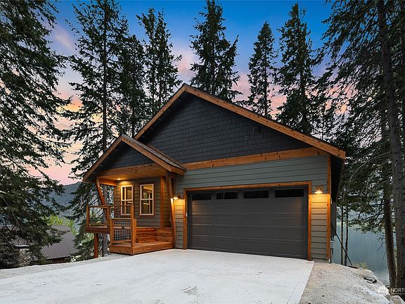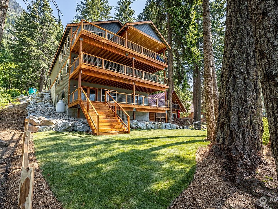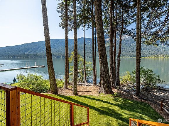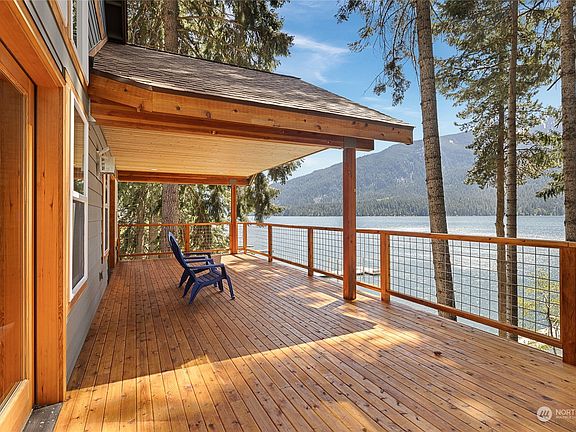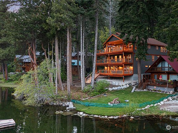 Custom North Shore Lake Wenatchee home ~ 3,900 sf of gorgeous living & 52' of no bank waterfront. Main floor is stunning w/Vaulted pine ceilings, timber frame styling & propane fireplace in an open concept living, dining & kitchen w/butlers panty & den/office. 2nd level~Primary Bedroom w/soaking tub & fireplace, 2 extra bedrooms & additional living w/fireplace. Lower level ~ 2nd kitchen & island, 2 bedrooms & bonus room for media/sauna or exercise. Dock Permit has been applied for. Amenities include granite countertops, vessel sinks, propane on 3 deck levels, Fiber, 2 car garage, extra parking & unparalleled views of the lake & Natapoc Ridge. Seller Financing Available