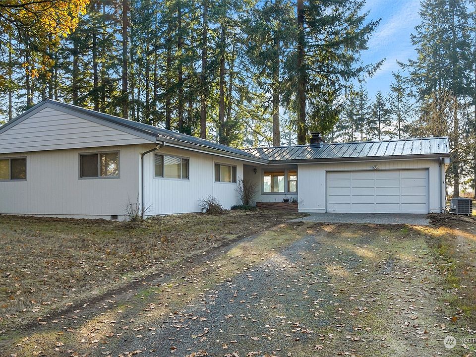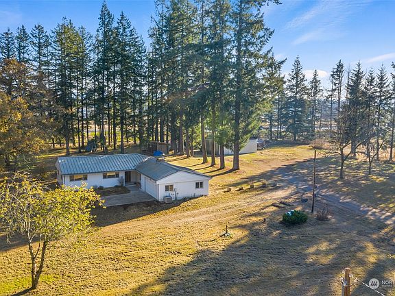 Classic Mid-Century rambler on 10.6 easily-dividable acres! Looking for an affordable move to the country? Check out this well cared-for, partially updated 3BR, 1.5BA home with 1432 SF on one level. Enjoy the updated kitchen, nice-sized BR's, & huge Living Room w/ gas fireplace, built-in shelving, & mahogany paneling indicative of the era. New heat pump, 2-car garage & newer metal roof. This home is complemented by it beautiful setting of towering firs, mature oaks, wide-open pastures, & creek-side woods. Big, well-built shop features power & water, & heated office/flex space. Cool original homestead cabin is only an idea away from being a guest house or ? Great options for your animals, too, w/ loafing shed & other small outbuildings.