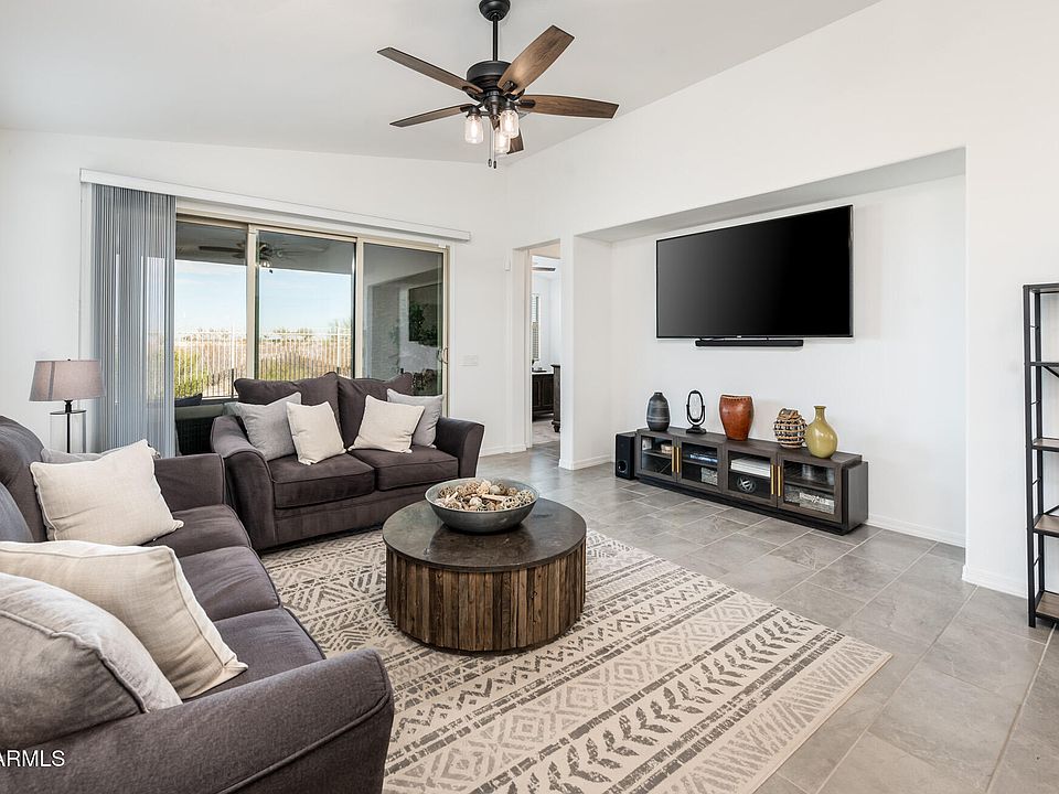 Nestled in an exclusive adult-only, guard-gated community, this stunning 2-bedroom home with a versatile den offers the perfect blend of comfort, security, and low-maintenance living. Designed with privacy in mind, the property backs onto a wash with no neighbors behind, ensuring a peaceful retreat. The spacious 2-car extended garage provides ample storage, while the front and backyards boast beautifully landscaped desert plants and low-maintenance features, allowing you to enjoy the outdoors without the upkeep. A charming front patio and covered back patio, complete with pavers in all the right places, create inviting spaces for relaxation and entertaining. Backyard plumbed gas for an outdoor kitchen. Gourmet kitchen with eat in kitchen, 42" upper cabinets, granite countertops, touchless faucet, large pantry and so much more. Triple glass sliding doors that invite natural light while seamlessly blending indoor and outdoor living. Both bathrooms feature double sinks, adding a touch of luxury and convenience. Whether you're enjoying quiet evenings on the patio or entertaining friends in your desert oasis, this property offers a perfect combination of style, functionality, and tranquility in an active adult community.