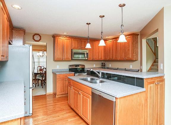 The front porch welcomes you to this desirable Stonebrooke neighborhood home. All freshly painted. Hardwood floors. New redesigned kitchen with custom cabinets, large multi level center island with breakfat bar and stainless steel appliances! Cozy livingroom with fireplace. Formal dining room. Main floor office. Main floor laundry. Large deck leads to nicely landscaped yard. 4 bedrooms up including large master suite. Lower level ready to finish. New water heater. Over sized garage., Directions 162nd St W/County Hwy 46 to Highview to Hollybrook Trail west to home.