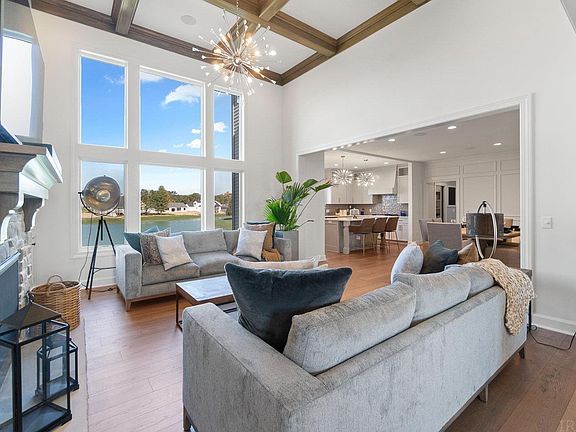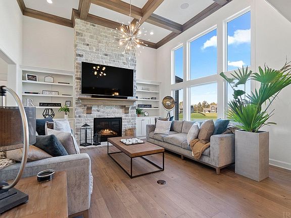 Spanning a gorgeous .72 acre pond lot in premier Tullymore Run subdivision, this 5 bedroom luxury home is only two years young and boasts an impressive collection of custom upgrades! Serenity awaits you as you pull up, where the home's stone facade offers a moment of awe. The covered front porch w/ glass paned door creates an overall sense of comfort & relaxation as you proceed inside into the grand foyer. The large windows in the living room frame out sweeping water views, drawing in the lush scenery of the outdoors to complement the neutral palette of colors indoors. An open floor plan emphasizes a sense of volume w/ coffered ceilings and a stone fireplace which soars to ceiling height, flanked by built-in cabinetry for that inviting warmth. Custom white cabinets coupled w/ quartz counters & Frigidaire Professional SS appliances set a gourmet aesthetic in the kitchen, w/ center island that visually anchors the space & offers a place for intimate gathering. A massive walk-in pantry stations itself around the corner for maximum organization potential, alongside the exquisite mud room with custom hall tree. The adjoining dining room grants an easy extension to the Trex deck and stamped concrete patio, ideal for savoring the views with your morning coffee or settling in with a favorite nightcap at the end of the day. The master bedroom is a destination all unto its own w/ raised tray ceilings, pond views & built-in linear fireplace w/ shiplap surround. For the true spa experience, the ensuite bathroom is a treat with double sinks, a luxe freestanding soaker tub, steam shower w/ dual heads, plus a phenomenal walk-in closet. This incredible home is primed for relaxation & recreation throughout, well suited for grand entertaining & intimate comfort alike. There is an outstanding wet bar in the basement including full size fridge, dishwasher & wine chiller. Also rounding out this space is a theatre room with tiered seating, projector, screen, & custom workout room w/ custom mirrors, plus a 6 person sauna & a built-in safe! The outdoors continues to impress w/ hot tub, whole yard irrigation, exciting play set, & trampoline area built in w/ retaining wall. The seller is open to including most, if not all furniture inside and outside of the home with an acceptable offer! Less than 15 min. from Parkview Regional Medical Center, this picture-perfect home in the Leo school district is just waiting for you to move in!