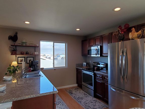 Newer home, lg open living area, large pantryoff dining room, 3 bedrooms on main floor, main floor laundry, master suite w/lg walkin-in closet and bath. deck to a lush lawn. and lawn has has edging and sprinklers. Finish the basement to your liking, set for plumbed for 2 bathrooms, wetbar/kitchen and studded for 3 bedrooms, extra heater in foyer, garage 26x22 is insulated, sheetrocked and heated. Seller will leave 3 TV's and Mounts, lawnmower, snowblower,