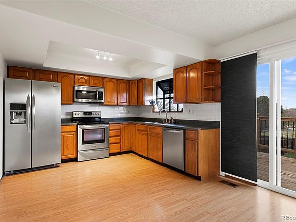 DON'T MISS YOUR OPPORTUNITY FOR THIS MOVE IN READY HOME IN STONE RIDGE PARK. Extremely convenient location with easy access to many amenities. This home offers an open concept kitchen and living space. The living room has beautiful and very functional built-ins for storage. The kitchen comes equipped with stainless appliances and has a great view of the open field behind the property. On the main level you will find two great size bedrooms with full size closets and a full bathroom. Downstairs you will find two more huge bedrooms and another shared full bathroom. Separate laundry space on the bottom floor - washer and dryer included. Park your vehicles in the 2-car garage or use for extra storage. The entire home has been freshly painted, deeply cleaned and is ready for you to make it your own! Directly connected to Side Creek Park!! The park features tennis courts, a lot of field space, and a playground. Close to shopping, restaurants, Buckley AFB, and medical facilities. Come check it out today!