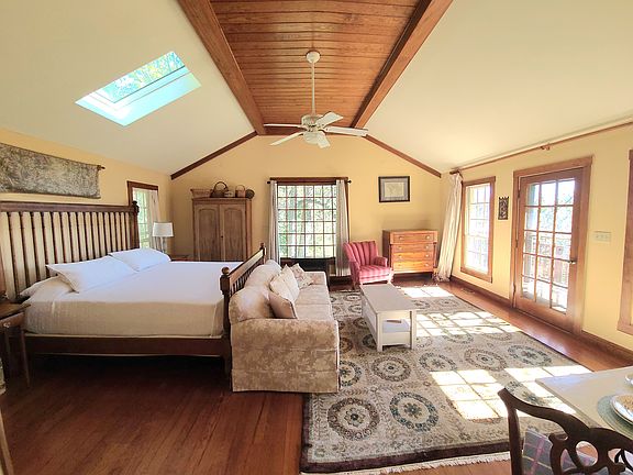 Truly A RARE FIND, All- Inclusive escape to Nature, Comfort and Convenience! VIEWS, pond, lawns and woods. FURNISHED COMFY KING, SPACIOUS, studio apartment with PRIVATE entrance, 5 floor- to-ceiling windows. Huge picture window sunrise or see the stars through the skylight over the massage bed! Light-filled large Living-Dining, VAULTED ceiling, comfortable 6' sofa facing deck views, dining table for 4. Coffee table raises for laptop or light meals. Click on your electric fireplace and relax!Fully equipped granite kitchenette, shelving and pantry. Large 4pc piece Master Bath with Jacuzzi Tub and a view! Large WALK-IN closet with room for dedicated workspace. 3 month minimum. Bed Side table touch lamps with USB. Granite kitchenette, deep sink, disposal, microwave, toaster oven, exhaust fan, small appliances, half fridge can be replaced with full fridge for long-term lease. Washer and dryer available. 5-10 minutes to shopping. NOTE: Provide contact information of who exactly will be RESIDENT AND YOUR PREFERRED TERM. phone conversation required before viewing. Property will NOT BE SHOWN WITHOUT THIS information and DL ID. Available to show. Minimum 3 month Lease, long-term available. Inquire for specific dates availability.