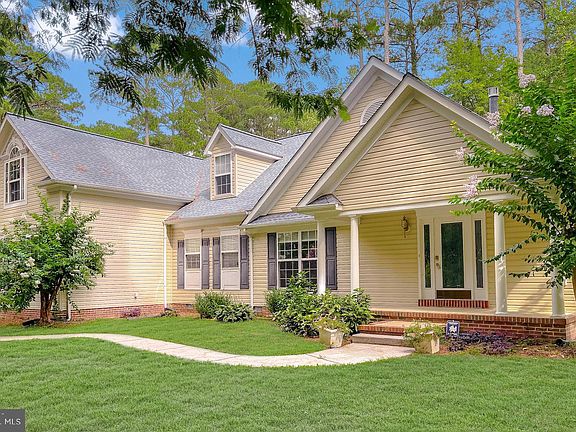 Gorgeous Cape Cod on a Beautifully Landscaped Premium Corner Lot in the Well-Established Neighborhood of Tall Pines. A Welcoming Covered Front Porch the perfect spot for enjoying the array of birds that live around the property. Open Floor Plan with 9 ft Ceilings and Gleaming Hardwood Floors. Stylish Large Living Room with Double Sided Gas Fireplace, 14 ft Cathedral Ceiling and a Built-In Surround Sound System that Conveys. Bright Kitchen with Maple Cabinetry, Stainless Appliances, a 5-Burner Gas Range with Pot Filler, Tile Backsplash, Breakfast Bar and a Huge Custom Pantry. Charming Dining Room/Sunroom with Custom Blinds. Glass French Doors lead to a Private Office. Enchanting Primary Suite on the Main Level with Walk-In Closets. Remodeled Ensuite Bathroom Fully Tiled with a Large Vanity, Jetted Tub and Separate Shower. Laundry Room on Main Level offers Extra Storage and a Full-Size Washer and Dryer that convey. Second Level offers Three (3) Additional Bedrooms, one with a Private Entrance to an Incredible 2nd Full Bathroom with a Sink/Make-Up Vanity, Soaker Tub and Walk-In Shower. Large Concrete Patio offers plenty of space for Grilling and Al Fresco Dining with a Cozy Gazebo that Conveys. Stamped Concrete Sidewalks lead around the Yard that is Surrounded by Mature Flowering Trees, Perennial Flowers and offers Plenty of Privacy. Shed and an additional Garage/Shed Convey. Two Car Oversized Garage with Automatic Door Openers, Workbenches and Built-in Shelving. Tons of Parking Space on the Huge Concrete Driveway. Only Two Minutes from Local Marinas and Boat Ramps, Five Minutes from Elementary School/Restaurants/Grocery and Twenty minutes from Pax River NAS. Water Access to St. George’s Creek just steps away and no HOA! Pride in Ownership Shows. A Lovely, Happy Home.