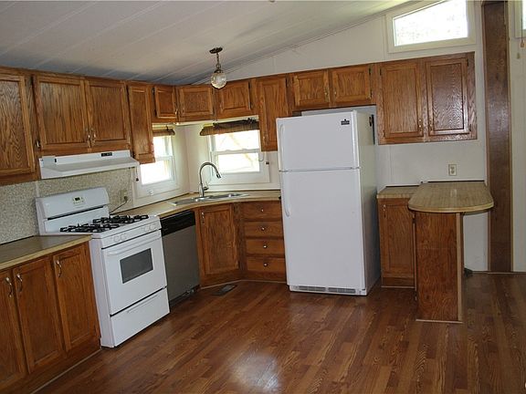 Located in Pine Meadows, a double-wide mobile home with a large kitchen area and huge living room, kept warm with a pellet stone that will heat the entire home. There are two bedrooms and one bath, along with a laundry area. There are two sheds to store items and a double parking space. Located on a corner lot with a lovely front yard and attached deck to enjoy the outdoors. There is a newer metal roof so little maintenance required.