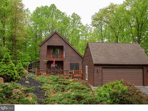 Peace, tranquility and nature abound down a long private lane leading to a welcoming 3 bedroom, 2 bath home. Situated at the end of a cul de sac, the beautiful, mostly wooded 10.85 acre parcel is bordered by 150 acres of protected Ringing Rocks Park Lands. In winter months the long distance views of the river valley are breathtaking. The charming 30 year old home features oak hardwood flooring in the kitchen, dining and living rooms, wood beams, cathedral ceilings and a two story stone fireplace and chimney. The kitchen has granite counter tops, updated appliances and vaulted ceiling. The spacious dining room is warmed by a wood stove which can heat most of the home! Adjacent to the dining room is a 3 season comfy sun room. The first floor is completed by 2 ample bedrooms featuring new 3/4" hardwood flooring, crown moldings, full bath with tile floor and new hallway carpeting. The second floor includes a generous family room with wood burning fireplace and outdoor balcony, a loft space perfect for an office and a large master bedroom with his and her closets and a master bath with shower stall and whirlpool tub. The entire interior has just been freshly painted and the exterior freshly stained. Some new windows and doors have also been installed. In addition, there is an over sized two car detached garage with attic storage space, a garden shed and recently installed wood fencing. A bonus lies in the fact that it is in Act 319 so the taxes are an affordable $5316 for 2018. What's not to love?
