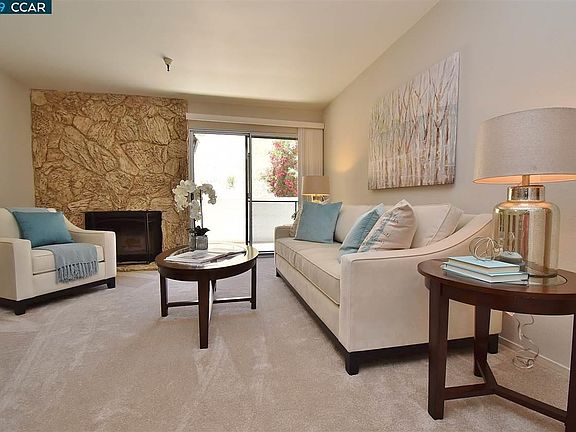 Move in Ready! This updated unit situated on the first floor boasts all new interior paint, carpeting, light fixtures, white cabinets, stone counter tops and updated kitchen and bathrooms. Living room with wood burning fireplace, dining area and slider to covered deck with storage closet, overlooking private hillside, great for relaxing! Hallway with 2 sliding door closets and laundry closet with washer and dryer. Master bedroom with double closets and updated master bath with stall shower. Updated hall bath has shower over tub. Take a break and relax and enjoy the community pool. This complex features an elevator and gated under building parking with opener.