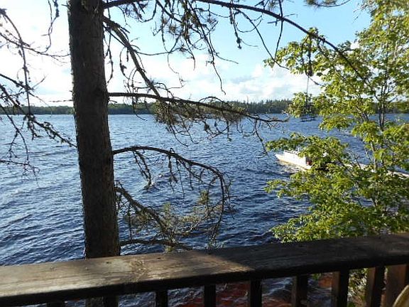 Yes, the home is that close to the water! Great sand beach, sauna at waters edge, screen house, 2 car garage, 2.7 acres with over 200 feet of meandering sandy shoreline. This lake home has lots of amenities. You can even fish right out the dining room window! 2 BR ranch style home with great field stone detail, only about 15 feet from the water's edge. Large open living room, kitchen & dining room open to each other view expansive views of the lake. Priced well below is fair market tax value, this is a rare opportunity!