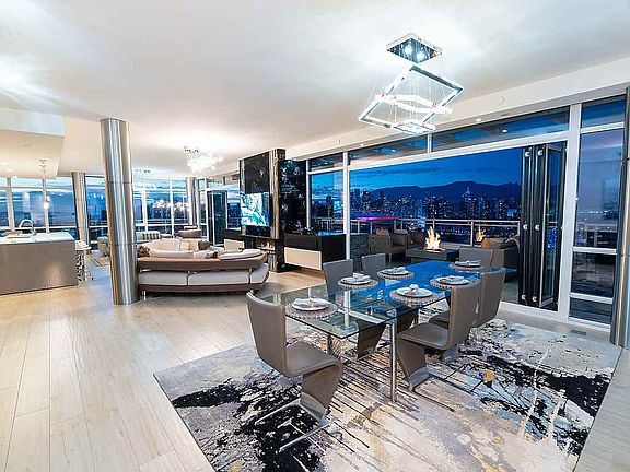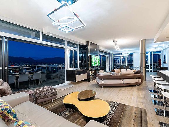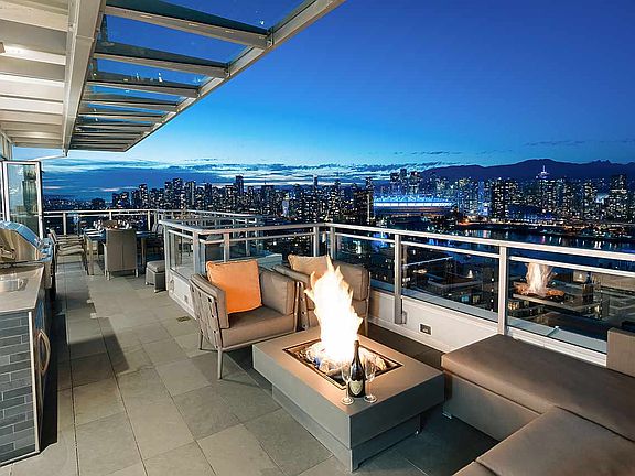 Jaw dropping panoramic views of Downtown Vancouver, Science World, False Creek, North Shore Mountains and much more from this truly one of a kind 3 bedroom and den sub-Penthouse residence at Opsal by Bastion! This custom designed 2 strata lot suite was designed by the owner to a very high standard to include Italian cabinetry, custom glass wall treatments, feature gas fireplace, dual eclipse doors and full outdoor kitchen and BBQ. The over 800 square foot master bedroom offers recessed TV, electric curtains, separate work at home space, wet bar and south facing balcony. Other amenities include 5 parking spots (2 Double Garages), high end appliances, custom plumbing and electrical fixtures, HOT TUB, and a total of almost 4,400 sf of combined indoor/outdoor living.
