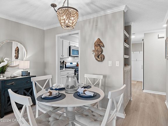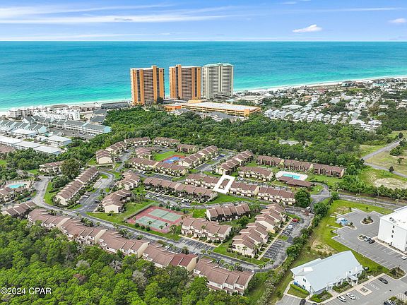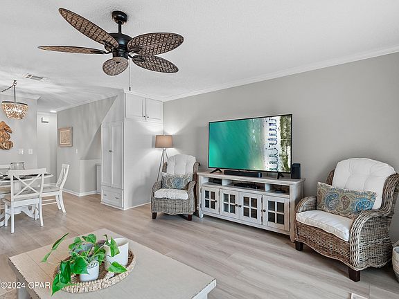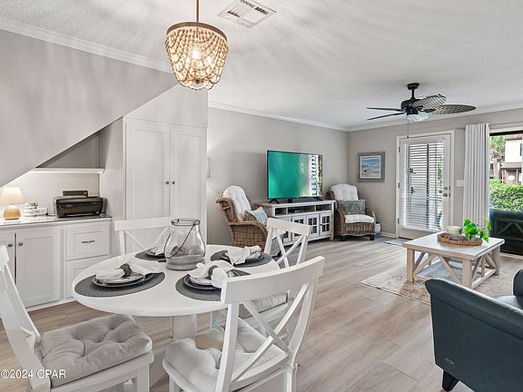 ***Offering Seller financing*** Freshly painted inside and out, this well-proportioned condominium is a short walk to the beach. It has two large bedrooms, two full baths and three covered porches, providing a relaxed lifestyle. Being an end unit, there are no neighbors above or below, and the offset placement gives each unit plenty of privacy when relaxing outdoors. Step through the newly added storm door and appreciate the neutral furnishings and gorgeous commercial-grade LVP flooring throughout the first floor. New carpet has been added to the stairs and second-floor bedrooms. The living area provides a comfy place to relax, socialize and watch TV. Also, on the first floor, there's a dining area, full bathroom, and kitchen with professionally painted cabinets. Stainless steel appliances include a French door refrigerator, gas range, and an under-mount sink with a Moen pull-down faucet and garbage disposal, all encased by quartz countertops. A built-in pantry provides useful storage with slide-out shelves and a pot/pan rack with similar slide-outs. Two exterior closets provide convenient storage to stow outdoor furniture and beach toys. The second-floor primary bathroom has a linen cabinet, a stunning glass shower enclosure, new tile flooring, and a framed mirror. Additional features include new LED recessed lighting, roller shades on the balcony, a tankless hot water system and an in-unit laundry closet with front-loading LG washer/dryer. It also has dedicated parking right in front of the unit. Beachwalk amenities include a swimming pool, pickleball and tennis courts, a community room and a pet walking area. Located just minutes from eateries such as Salty Sue's and Mike's Oyster Bar, this gorgeous condo is 3.4 miles from Pier Park attractions. A newly replaced private bridge leads to beach access 72 (via Wendwood Condos), a leisurely nine-minute walk away.