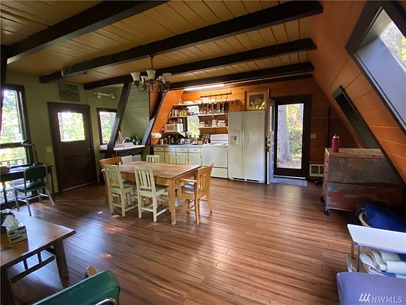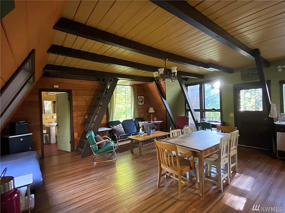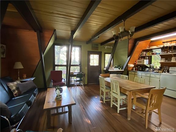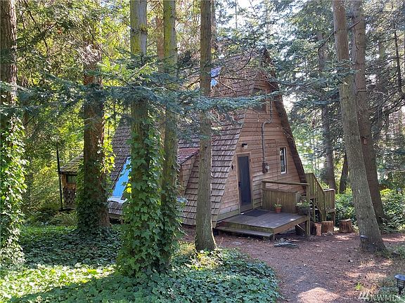 Secluded cedar shaked A-frame in the dense woods. Peek-A-Boo view of Skagit Bay with beach access. Large wooded double lot could accommodate an additional dwelling. 50 year lease, tied to local index. 5 minutes to La Conner.