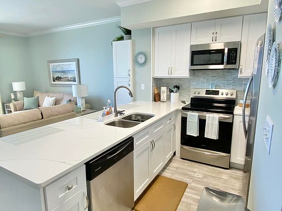 Beautifully updated in a lovely Coastal design, this Beach Front condo features New Quartz Countertops, Gorgeous Backsplash, Cali Flooring, and tasteful new furnishings. 2 Full Baths & built in bunks allow sleeping for 6. Meticulously cared for & maintained Water Heater replaced in 2014; New Appliances in 2017; Washer/Dryer in 2020. 2022 remodel included Kitchen & Bath Cabinetry, Counter Tops, Cali Plank Flooring, New Sofa & Loveseat.