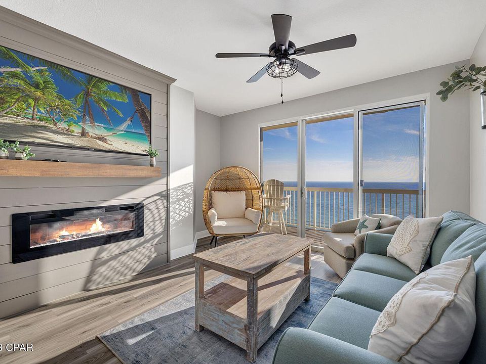 All Brand NEW furnishings and appliances! Absolutely Gorgeous !! Coastal elegance at its finest. 30A refinement at PCB pricing! This unit is customized and upgraded from the continuity of colors (soft greys and whites) throughout to beautiful quartz countertops in kitchen and bathrooms, LVP flooring, stainless appliances and decorative backsplash. Look out at the gorgeous emerald green waters of the Gulf from your master bedroom or living room and watch amazing sunsets, see the dolphins playing and the occasional manatee swimming by. This unit is furnished with all brand new furnishings throughout. The walls in the main areas are elegantly accented with attractive shiplap. The living room entertainment wall is well appointed with decorative ship lap, electric fireplace and a large mounted flatscreen TV. The complex features two pools- one beachside, one across the street (heated)-a well equipped fitness center, plenty of parking for guests in the large garage, tennis and more. One spot is available with this unit for private use- spot #2