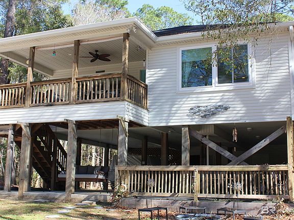 Riverfront cottage on Fish River. There are wonderful views from back deck, main living areas and the main bedroom. Seller has updated home with new windows, gutters, fresh paint throughout, new kitchen appliances, new light fixtures and has done extensive landscaping upgrades including adding a boardwalk from home to river. Home is comfortable and inviting. Ground floor offers parking space and room for outdoor cooking and relaxation. Approximately 60' of waterfront, includes bulkhead, a dock, a gazebo, a screened tree house and piers in place, ready for a boat lift. Large lot has lots of room for outdoor games and entertainment. Power access is available for RV parking.