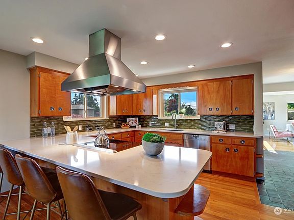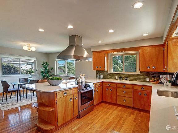 Classic mid-century, updated with taste, function, & revenue generating solar panels! New, permitted upstairs primary bedroom with huge walk-in closet & bathroom w study area. Peekaboo Cascade & Olympics view from upstairs, kitchen & patio. Finished basement with remodeled kitchen for mother in law - more revenue generation. Open kitchen & dining room perfect for entertaining. Private backyard feels like a park, walk to Jefferson Park trails, golf, playfields, fruit stand, cafes, VA hospital, on a bike friendly street and nearby schools.