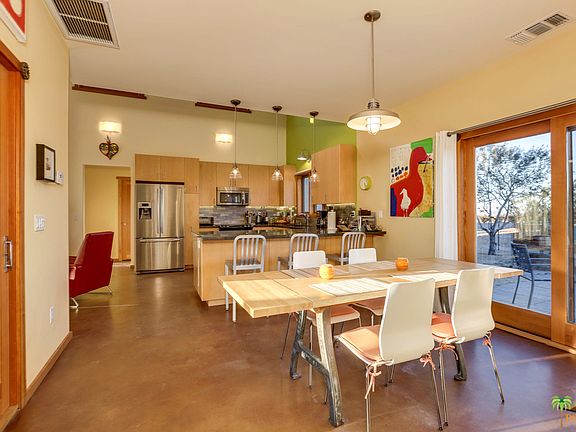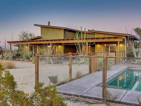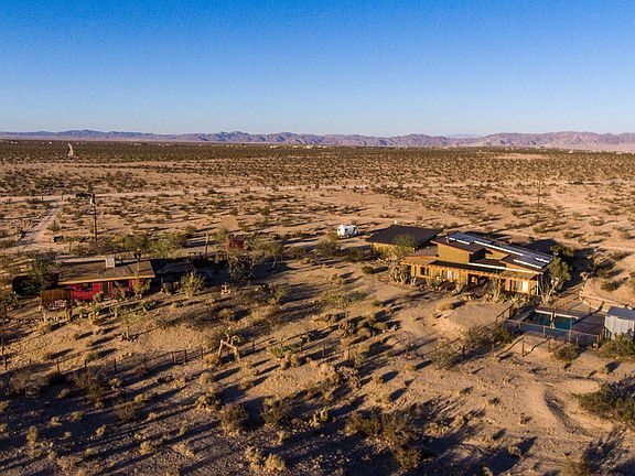 Welcome to the highly coveted area of Coyote Valley in Joshua Tree! 5 acres, mostly surrounded by untouched BLM land, holds a 1330 sq ft Main House built in 2009 and a custom renovated 1950's Bungalow by the design duo behind Mojave Rock Ranch Resort! An open floor plan with 14' ceilings, clerestory windows, and a covered outdoor patio with roll down glass door brings the outside INSIDE for the ultimate desert experience. High end finishes in the kitchen will have you ready to cook and dine in style. Relax by the in-ground saltwater pool, stargaze on the hilltop flagstone sitting area, or meditate next to the lily pond, your choices for rejuvenation are plenty. There's a detached garage with finished office, 33 OWNED solar panels that help keep the electricity cost WAY down, and the bungalow has been a successful vacation rental since 2011. Welcome to your new desert sanctuary.