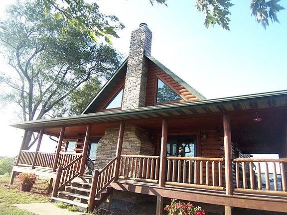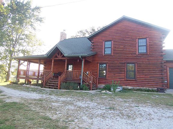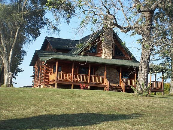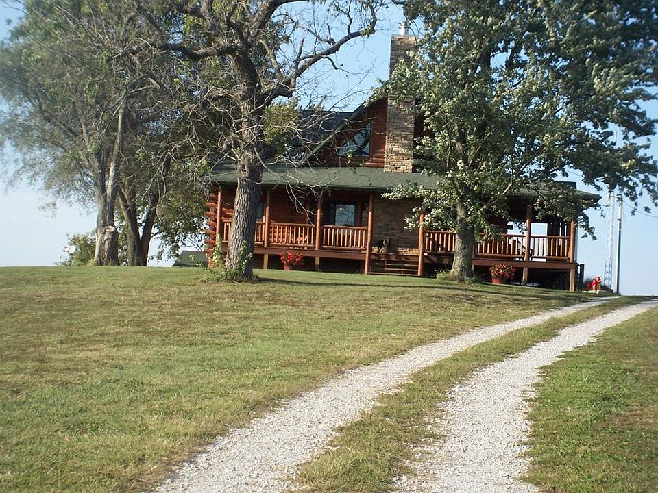 Hilltop setting for custom built log home on 103ac m/l, 4 bedrooms 2 baths, Pine logs, Ash flooring, Loft overlooking Vaulted ceiling family room and fireplace, kitchen and bar with GE Momogram appliances, full basement, covered deck on 2 sides of home. 2 car attached garage, 3000sqft Star metal building, heat & air in office & woodworking shop, overhead door, covered picnic shelter house with cement floor, Farm is Fenced 2 ponds, timbered draws for the deer hunter & open pasture for horses and cattle.