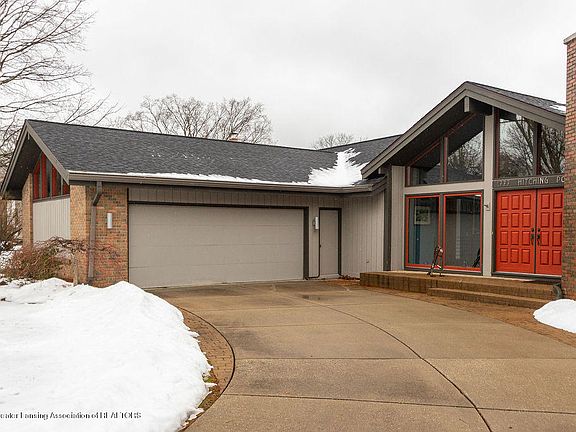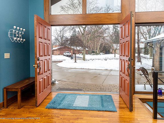 Wonderful offering in East Lansing! Mid-century modern home situated in a prime location in East Lansing nestled on over a half-acre mature parcel in a park-like setting that is immediately adjacent to Albert A. White Memorial Park in the Whitehills subdivision and one block from brand new Whitehills Elementary School. House built for entertaining (former MSU provost's home) with top-of-the-line updated amenities inside and out of this treasure of a home with approx. 5,000 sq. ft. of luxury living space. Five bedrooms, four full baths. Architectural appointments and hardwood flooring through most of the 1st floor including custom wrought iron staircase banisters. Enjoy bringing the outside in with floor to ceiling V shaped windows in the great room accented with cathedral ceilings and a marble fireplace. Adjoining formal dining room with access to raised deck with herb planters and hard-wired gas line for BBQ with entertaining in mind.