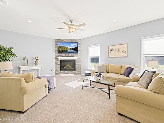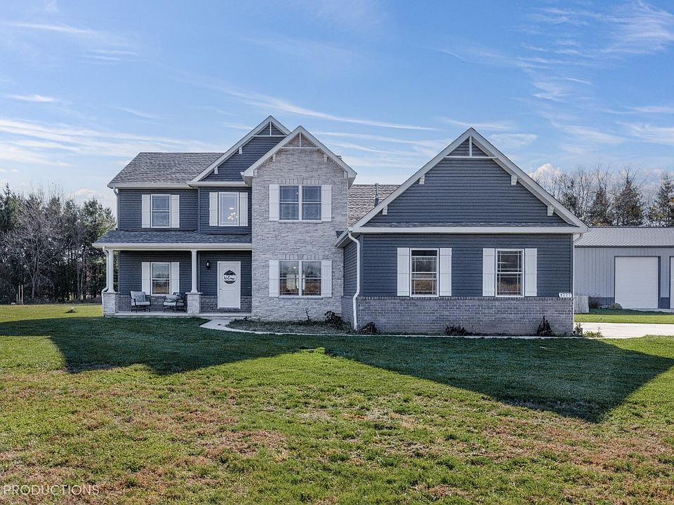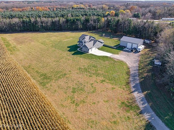 Discover comfort and tranquility within this thoughtfully crafted two-story home, completed in 2021, featuring 4 bedrooms and 2.5 bathrooms, with a ready-to-finish basement. Embrace the outdoors on the inviting covered front porch, where a beautiful view unfolds across over 12 acres of land. As you step into the foyer, your attention is immediately captured by the stunning wood-finish staircase, setting the tone for the welcoming ambiance throughout. The master ensuite on the main level is a retreat in itself, featuring a free-standing tub for ultimate relaxation. The heart of the home lies in the well-appointed kitchen, featuring counter seating, double oven and a walk-in pantry. The overlook area, adorned with a chandelier, features a gorgeous big window framing the surrounding scenery. The property includes a 42x50 pole barn and an attached 3 car garage. Envision celebrating the holiday season in your new abode, where every detail is designed to enhance your living experience!