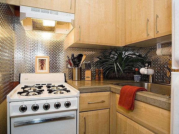 Built-in desk nookMetal backsplashesCentral evaporative coolerWood floors