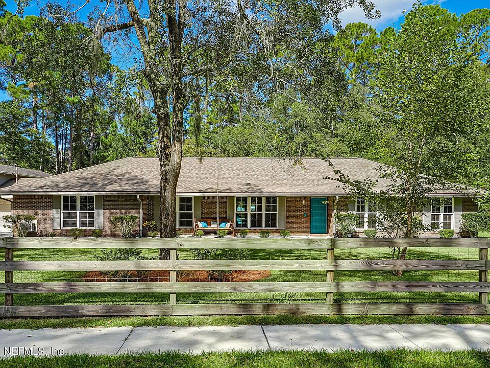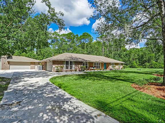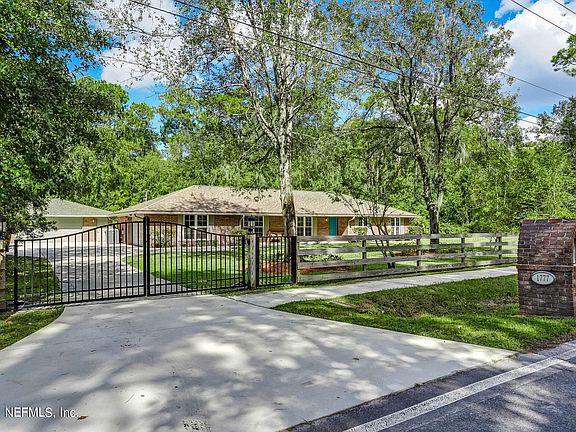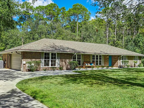 Multiple Offer Situation. All offers due by 12pm, Tuesday, 10/26. Truly ONE OF A KIND! Come home to your private 1 acre estate in the heart of Mandarin. Great home for entertaining with open floor plan, lots of parking and space for gatherings inside and out with complete privacy in backyard. Special features include over 2000 sq ft of garage space, custom 25x25 detached garage plus a 17x60 RV/boat storage with 12ft rollup garage doors front and back. Electric operated black aluminum gate with second paved driveway at opposite end of fully fenced property. Beautiful all brick ranch style home offers 4 bedrooms, 2.5 baths plus office. Gourmet kitchen features top of the line stainless steel appliances, 46'' white Shaker cabinets with under-mount lighting, brushed nickel hardware, soft close doors/drawers, pull out drawers, spice racks and lazy Susan. Open floorplan with vaulted ceiling, beautiful hand-scraped wood floors in main living area. An abundance of natural light filter through the new vinyl windows and sliding doors adorned with 3" Plantation shutters. Huge owner's suite with updated, spacious shower and walk-in closet(s). Second bath fully renovated in 2020, updated half cabana bath with exterior hot/cold shower. Enjoy your backyard paradise year-round! Electric heated saltwater pool with sun shelf, and swim lane. Covered patio with plenty of space for outdoor kitchen surrounded by beautiful landscaping, updated irrigation system (2019) and irrigated garden area. Other extras include water softener, insulated garage doors, HVAC window units in garages and gutters. Detached garage plumbed for *air compressor and has an *11k lbs 2-post car lift. (*negotiable).
