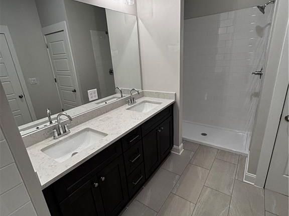 The primary bedroom features a generous walk-in closet and an attached bath with dual sinks, a separate tub, and a shower. A second bedroom with its own bathroom sits on the upper level, along with a laundry area with washer/dryer hookups. The ground floor includes a third bedroom and full bath, offering flexibility for guests, office space, or additional privacy.
