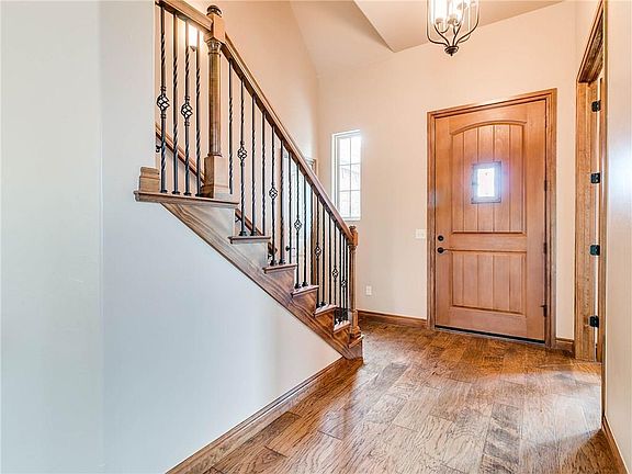 This stunning new home is back on the market! You'll love the quality craftsmanship in this new home with gorgeous wood floors in the entry, living area and study. Dedicated study has a full wall of built-in bookcases. Living area features cozy gas log fireplace, crown molding and a lovely view of the private back yard. The kitchen features custom maple cabinets with granite counter tops, huge island, upgraded stainless steel appliances, coffee bar, and a walk in pantry. Dining area with built-in hutch. Large laundry room with a sink and lots storage and counters. Downstairs master suite has a walk in shower, whirlpool tub and granite double vanity and large walk in closet. Upstairs are 2 bedrooms with a Jack 'N' Jill bathroom in between. There's a theater/bonus room and a reading/sitting area. Sit on the covered patio with a view of the wooded private back yard. Sprinkler System. 20 mins. to Tinker AFB and Boeing.