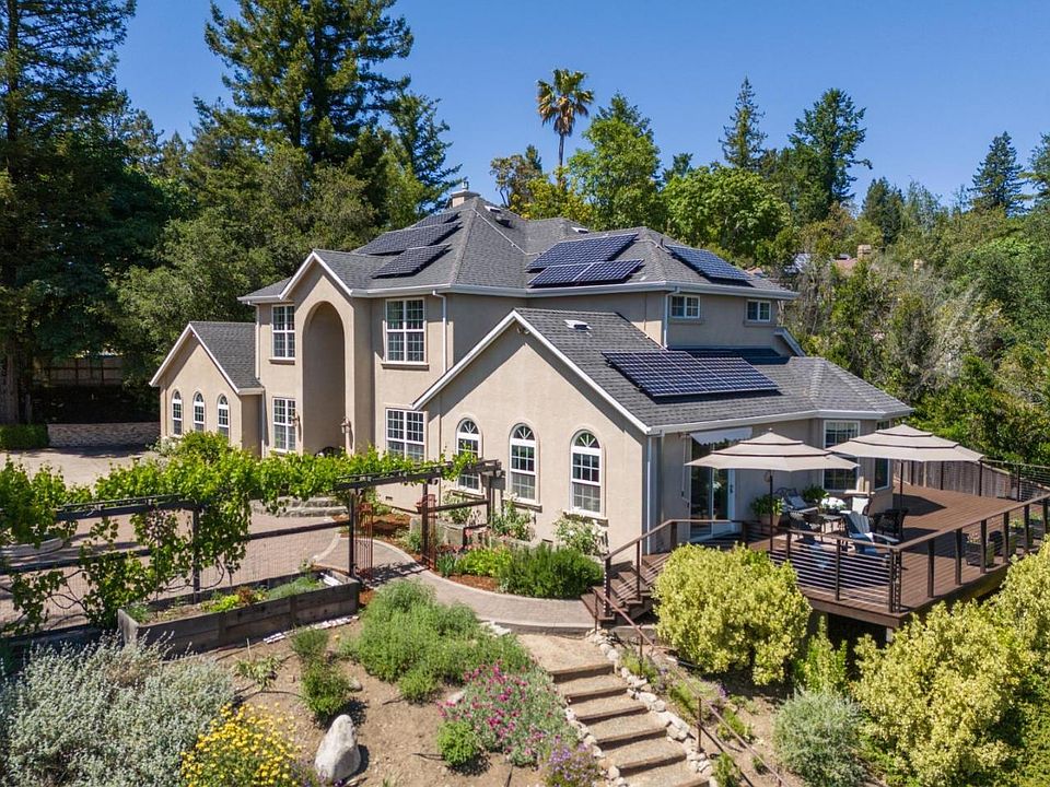 Magnificent custom built estate, only 1 min from Hwy17/Summit. Set back on a long private driveway with breathtaking long range views over mountains and canyons, and a sliver of the ocean on a clear day! Impressive formal entry and living room, 2 stories high. Arched window and huge chandelier, elegant curved staircase with wrought iron balustrade. Formal dining room. Separate family room with built-in cabinetry and entertainment center, gas fireplace, sliders to the view deck. Spacious kitchen with cherrywood cabinetry, quartz counter tops and island, stainless appliances, sunny breakfast dining nook. Primary suite on the ground floor, with sitting area, walk in closet, recently remodeled spa-like bathroom. Office or 5th bed with full bath. 2nd floor comprises guest suite/second primary, two further bedrooms and hall bath, connected by an open bridge over the living room and foyer. Expansive circular paver driveway with a central 'fountain' planted with succulents, offers ample parking. Detached 3 car garage with built-in cabinetry, storage, plus attic. Potential to convert to ADU. Over 1.3 acres, gently rolling grounds with meandering pathways, sun deck, and colorful drought tolerant landscaping. Southern exposure, all day sun. Solar (owned) & batteries. Excellent private well