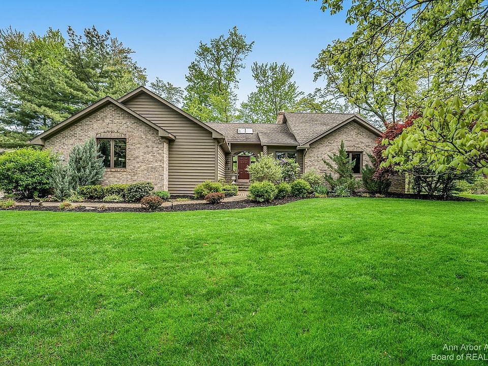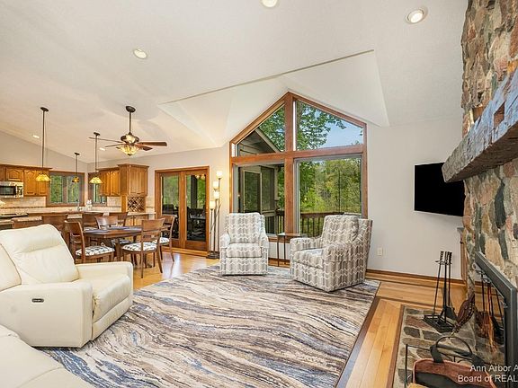 Nature lovers dream with a 4 bed/3 bath brick ranch on 20 acres backing up to state land & Waterloo Rec area! Well maintained & lovingly cared for home with open great room featuring vaulted ceilings, stone wood burning FP, hardwood floors & expansive windows. Granite kitchen with generous snack bar, tile floor & SS appliances. Dining area walks out to screened porch overlooking the 20 wooded acres & abounding wildlife. Main floor primary suite with private bath & w/in closet walks out to rear deck, while 2 addl beds share 2nd full tile bath. Full fin w/out basement offers custom kitchenette, dining, rec & family room with cozy wood burner. 4th bed & full tile bath, perfect mother in law suite. 32x48 pole barn with 12' ceilings, loft & hoist for the hobbyist, along with custom concrete patio for entertaining. Boardwalk leads you through the woods, bordering 100's of acres of Waterloo Rec & state land, ideal for hunting & rec use, while just 2 miles to downtown Chelsea or the highway. Energy efficient home with geothermal heating system & nearly all new Andersen windows. Original owners planned something for everyone, ready for the next family to enjoy! Showings begin with open house 5/22 12-2!