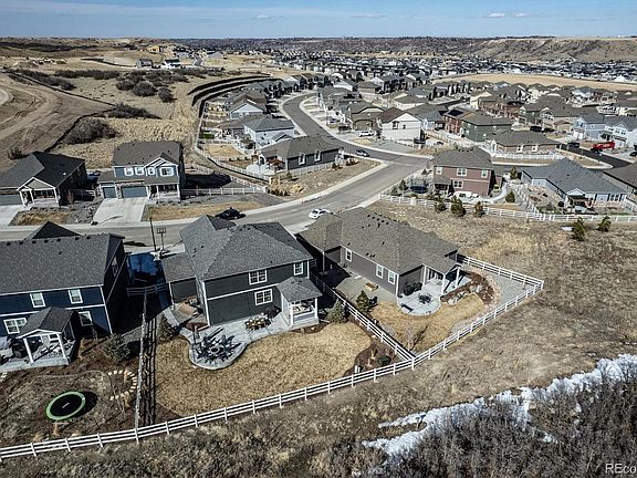 Welcome home to this absolutely beautiful 3 year old D.R.Horton 5 bedroom"Hayden Model" backing to the historic 1,500 acre Ditmars Ranch. This home is in "like new" condition and features wonderful upgrades throughout (inside and out) that will impress and delight the most particular buyers. The glass 6 lite-panel front door and the open stairway creates an inviting flow and peaceful ambience as you first enter this home. The main level features the formal dining room or home office/study that could also be used as a sitting room or music room. The large "chefs' kitchen, eating area and great room are ideal for entertaining and family gatherings and is the truly the heart of this home. There is a main floor bedroom and full bath offering your guests privacy and independence! You'll fall in love with the spacious 14' x 13' Primary Suite that includes an additional 11' x 11' sitting area, en-suite bathroom and large walk-in closet. There are 3 more bedrooms, a full bath, the "family sized" loft space and convenient laundry room making the upstairs truly designed for family living! The back yard setting is a one-of-a kind that you will immediately realize as you step outside to your 10' x 10' covered patio and the additional 500 square foot curved patio: all backing to open space with abundance of wildlife! The owners have planted over 300 bulbs in the front and back for your bloomin' enjoyment including tulips, daffodils, dahlias and bearded iris. There is a sprinkler system that includes drip lines and an installed water gathering system and storage tank for water conservation! You'll love the amenities offered with the Crystal Valley Ranch clubhouse, fitness center, pool, tennis courts and Rhyolite Regional Park. This is a great neighborhood and location close to incredible Douglas County Schools, shops, restaurants and fun local festivities that add to your enjoyment and enrich your lifestyle.