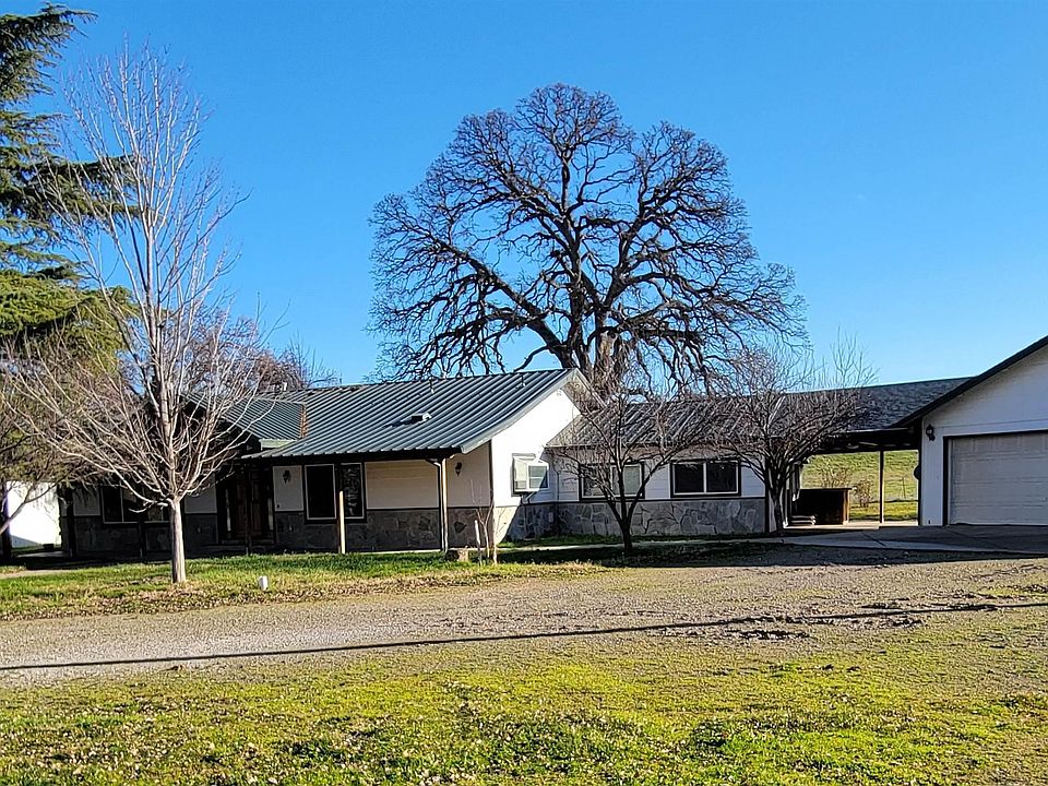 Beautiful home on 10 acres surrounded by large ranches. Mature landscape plants, family orchard and huge old oak trees. Home has a fabulous gourmet kitchen with huge island and deluxe Wolfe stove and double oven. Greatroom holds a large family dining table. Vaulted beam ceilings and wood stove. 2 bedroom and 2 full bathrooms. Also a family room that cound be game room, TV area or a large master suite. Extra large owner owned solar system. The 10 flat acres are ready for unlimited possibilities. Room for barns, arena, RV parking. Must see to appreciate all that is here.