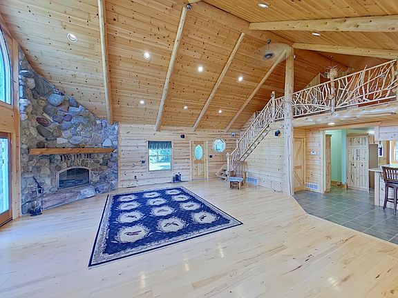 A beautiful 3 bedroom 3 bath home on a stunning 3.1 acre lot. Stroll across the huge deck and into the great room with gorgeous soaring wood beam ceilings and rustic, corner, stone woodburning fireplace. The honeyed pine walls and flooring will amaze your guests as they come through to the tile floored kitchen with natural wood cabinets and tile backsplash. Your main floor primary bedroom is ensuite with a walk-in closet and 5 piece bath. Up the intricate wood rail lined staircase you will love the lofted space which adds to your living area, and the additional 3rd bedroom with full bath. Outside you will have plenty of room to roam, as the property includes over 3 acres, a barn with 4 stalls for your four legged friends, a wonderful workshop detached from the home, and pond from which to view the local wildlife. An office space and sitting area in the heated 3 car attached garage with a full bathroom round out your conveniences. This home will steal your heart.