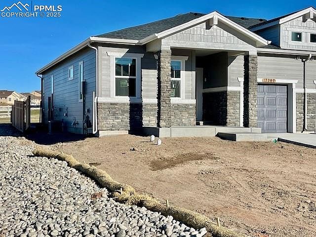 Ready now! Valley ranch plan with 1 car garage in the new Monument Junction Cadence Collection neighborhood. 2 bedroom, 2 bath home. This home is one side of a duplex. Kitchen features Shaker-style white cabinets, Simply Grey Quartz countertops, island that seats 3, pantry, and stainless steel appliances including gas range. The main level master bedroom hosts a walk-in closet. The master bath showcases a shower with seat and vanity with double sinks. The master bedroom is separated from the secondary bedroom creating a quiet, serene space. Enjoy the outdoors on the rear patio accessed from the great room. Home comes equipped with blinds in the bedrooms and bath, air conditioning, smart home package and radon mitigation system. Home is located in a covenant protected community. Seller incentives available. Full yard xeriscaping included.
