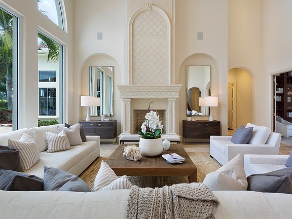 A rarity for its stunning panoramic lake views and secluded point setting, this elegant Modern Mediterranean estate presides over 400+/- feet of waterfront that sweeps across two sides of the grounds. Gorgeous landscaping and a grand entry make a perfect first impression. By the lakefront lawns, the resort-style outdoor entertainment space centers on a fountained pool with a spa across from the inviting fire-lit loggia.